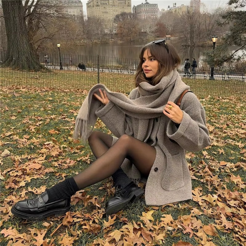 Med sitt mjuka tyg och den integrerade sjalen erbjuder kappan både värme och en snygg look. Den är idealisk för allt från promenader till avslappnade kvällar.